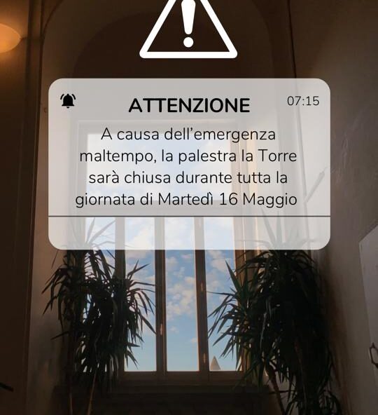Si comunica che la Palestra La Torre rimarrà chiusa per tutta la giornata del 16 Maggio in seguito alle direttive comunali sull’emergenza maltempo.